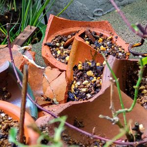 おはようございます😂 昨日の夕方、我が家の玄関先に突風が吹き込んだらしく、小さな鉢植えが割れたり、載せていた縁台が壊れたりと台風でも見たことがない様子になってました。 帰宅後、暗い中、手探りで簡単に苗の状態を確認。すでに休眠期に入っていたものがほとんどで、苗自体には大きなダメージはないようでした。 今日、予定はないけどたまたま休みを取っていたので、後片付け、植え直し等をやります😞 ちなみにお隣さんはフェンスが倒れてました。