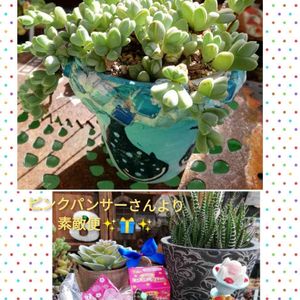こんにちは🍀 🏷️ トトの日参加します🎶 私んちの 🐟ヘキちゃんは トワさんのジンベイザメリメ鉢でスクスク成長してる➰🎶 先日 ピンクパンサーさんより 沢山の素敵便✨🎁✨が 届きました😀 以前の 私のpic で 4年前結婚記念日に旦那からもらった 十二の巻 が、 今年の大寒波で☆に なったの 読んでくれて 立派なお子ちゃまいっぱいついた鉢付き(旦那がくれたのよりかなり立派😀)を 送って下さった💗 かわいい手作りスイーツ🍰リメ鉢やピック この辺で見かけなくなったペコちゃん フェイク多肉ちゃん スイーツキーホルダー ありがとー😆💕✨ 繋がりに 感謝🍀 大切にします😀 久しぶりに たいやっきーピック作ったら 前回より さらにマンボウか 🐡フグみたいに💦😂