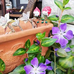 こんにちは🍀 今年もツルニチニチソウが 咲き始めました➰🎶 🍓の日に 即興で作った 🍓のごっつぁん(いち 五郎😅) 顔描きました かわいい女の子👧じゃなく流し目ぎみ キモカワおっさんイメージが中性若僧に やっぱ顔難しい💦 クルミやぎんなんでいちご🍓ちゃん みどりのまとめ に簡単に 投稿しました😀