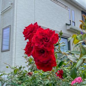 赤バラドンファン🌹 秋バラ?になるのかな?? 夜の気温が涼しくなってからギュンギュン伸びて、見事な大輪咲きとなりました😊💕 中香と書いてありますが、ぶっちゃけ微香💦 たま〜にほんの〜り香りがします(ノ∀`笑) つるバラですが、しっかりした花弁で雨にも強く、花もちも良く、ステムが長いので、うちではもっぱら切り花に🌹 綺麗な深い赤色🌹 いつまででも見ていられる美しさです +゚*。:゚+(人*´∀`)ウットリ+゚:。*゚+.
