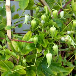 初めて育てた壺型クレマチス、ひどい うどん粉病にかかり、見るのも触るのも気持ち悪いほどになり、バッサリカット✂️したら、新しい茎が出て葉っぱが茂り、誘引どうしていいかわからずに先送りしてたら絡まって、どうにもならないところまできて…… 、そして可愛く咲いていた😂💦 まだ伸びているけど、ほんとどうしていいか わからん🤣