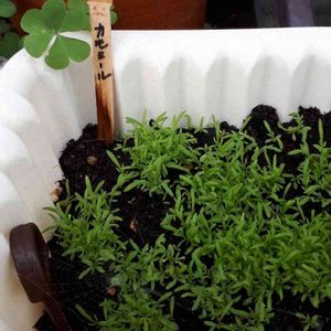 千日紅のプランターにある芽 カモミールの芽🌱に似てる。 何故? 時期はずれてるはずなのに…? もう少し、様子見てみます。❔