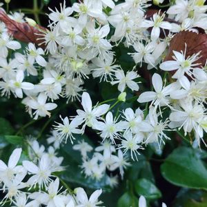 ♡センニンソウ♡日本原種小輪クレマチス 10/14蕾投稿から満開になりました。 ● キンポウゲ科センニンソウ属に分類されるつる性の半低木の1種。属名は「若枝」を意味し、種小名は「3枚葉の」を意味する。和名は痩果に付く綿毛を仙人の髭に見たてたことに由来する。別名が「ウマクワズ」、有毒植物で馬や牛が絶対に口にしないことを意味する。茎や葉の汁は皮膚炎の原因となる。 学名: Clematis terniflora 分類階級: 種 上位分類: クレマチス 科: キンポウゲ科