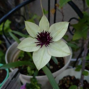 カザグルマです。 自然大好き派😘、兼園芸も好きかも派😅です。このカザグルマは種から育てて8年目です。普通は7年目から開花しますが、この鉢は8年目での開花になりました😊🤗。長いような気もしますが、開花を見ればアッと言う間です。なにせ、発芽まで2年ですから、全ての時間軸が長い植物です。 発芽は70.80本芽を出しますが、ここまで育つのは少ないです。開花を見れば疲れが吹き飛びます😭😊🤗。