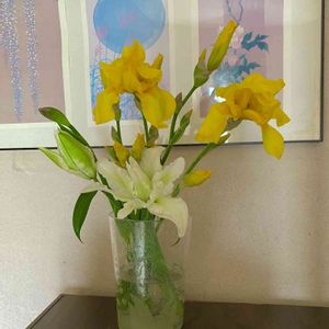 黄ジャーマンアイリス 白八重オリエンタルリリー 花友さんに 頂いた花 飾りました