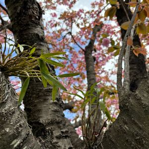 会社の八重桜の木に張りつけたセッコク 2種。 空っ風吹く群馬の地で今年も無事冬を越し、元気にしてます。 元気にしてるけど、今年も花芽はつかなかったご様子😅 会社八重桜、とってもきれい🤭
