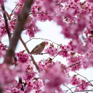 2019.3.31 神奈川県相模原市 城山カタクリの里にて おかめ桜とメジロ おかめ桜と陽光桜の札が先週と入れ替わってるような…。どっちがどっちかわからなくなりました。