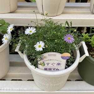 🌸お花便り 【#すぐ楽星空マム 】 🗓️定植2025-10/21 → 2025-11/10 (2w6d) 🗾愛知 🧭南西 ☀️4時間 🪴6号1株 🚿雨のみ 🧴土が乾いたらそろそろあげたい 雨が多いから水やりしなくて良いし☔バタバタ生活していたので「いつの間にか咲いてくれていました🤭」📌④⑤は定植時のpicと比べると株が少しずつ🤏充実してくれてるかな(願望含む)🧐✨ぼちぼち商品ラベル(タグ?🙄ポップ?かな🙄)外してあげた方が良さげだね〜🐒🌱 この子はこのままお花を楽しみながらで良いのかしら?蕾摘みした方が良い?アドバイスお願い致します🐵