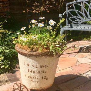 ダリアシャイニーと星空マムの寄せ植えを作りました。 優しいクリーム色の花びらにピンクの縁どりが素敵です。