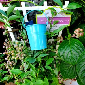 お花屋さんの店先 あら可愛いバケツが付いている🎵 ブルーベリーの実が色づいたら収穫用なんですね。