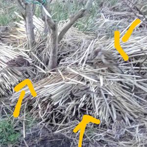スズメの朝ご飯 ブルーベリーの株元ねワラの周りをつついてる 米かミミズか、草の種か⁉️ 大食漢のヒヨドリよりずっと可愛らしい😉