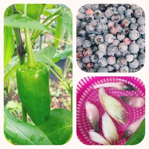 今日の収穫😁 種無しピーマンやっと一つ大きくなりました! ブルーベリー、ネット外して残りは鳥にと思ってたのに何故だか食べに来ないのでまたたくさんなっててついつい収穫😅 ミョウガは長雨のおかげか出てきてました!プランターで育ててるので端っこにばかり顔出してぺったんこ🤣