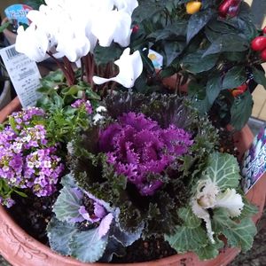 葉牡丹の寄せ植えつくりました。お正月に玄関前に出動予定です✨ その前にアリッサムの花が先終わりそうな感じが。。 今切り戻すべきか悩み中🤔