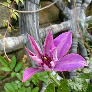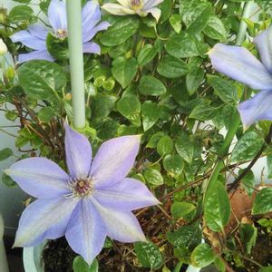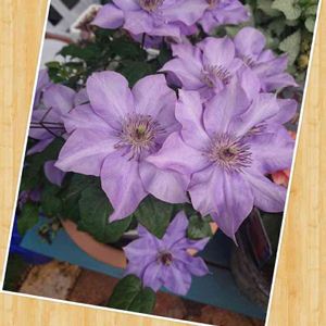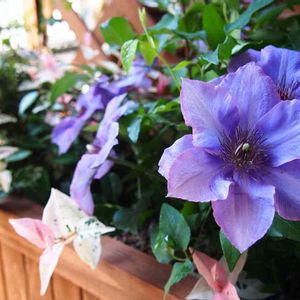 主人の仕事(造園業)の廃材を使って。 2種類のクレマチス。 1鉢は、ミゼットブルー。 もう1鉢は、ピンクのベル型。名前は何かな?( ˆ꒳ˆ; )