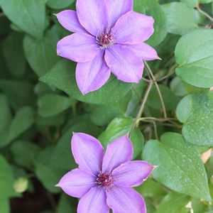 クレマチス 雨の朝☔ 実家から株分けしてもらったクレマチスが 二輪一緒に開花してました ヽ(=´▽`=)ノ 品種が分からなかったので色々調べてみました! 花も蕊もどちらも青紫色なので… ザ・プレジデントだと思われます😊 調べ直したら🔍️ こちらはミゼット・ブルーのような気もします?? んー 判断付きません😳