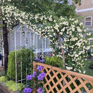 クレマチスの白万重が動き出しました〜🌿 お隣のミゼットブルーは、夏の間、新芽が出ては枯れてを繰り返し、なんでかなと思ったらトレリスが昼間触れないほどアッツアツになっていて、誘引したせいで葉っぱがやけどしてたからでした。。😱 プラなのに、酷暑でどれだけ熱いんだー😖 なんとかせねばと、トレリスはなるべく熱吸収しないようにと、白く塗りました。 ついでに木の細い棒でとんがり支柱も作ってみました😊 これで来年はマシかな。 3枚目は白くする前。枯れたミゼットブルーの葉が痛々しかった💦ゴメンヨ 今日はこれから花友フェスタに行ってきます。 楽しみ〜🌸🌿
