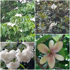 ①唐種招霊(からたねおがたま) モクレン科 常緑低木 半開状に咲く花 直径2~4cm あまり目立ちませんが〰︎ バナナ🍌のような甘い強い芳香 緑色の部分が雌蕊💚 触手のようなものが雄蕊 ②③④アロニア バラ科 別名 西洋カマツカ 直径2cmほどの小さな花 5弁花 突き出たシベの先端は 赤く膨らんでよく目立つ❣️