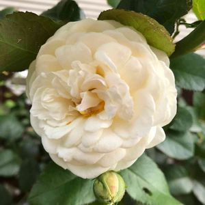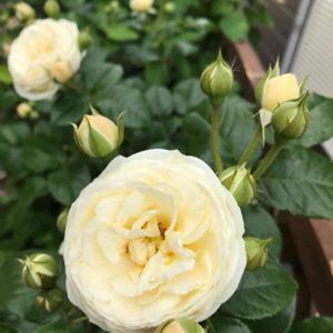 ころん♪としたクリーム色のかわいいツル薔薇です。 今年もたくさんの蕾を付けてくれています。