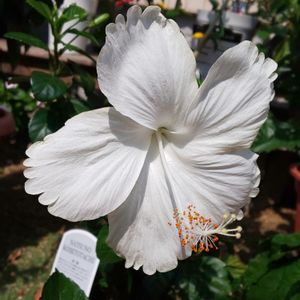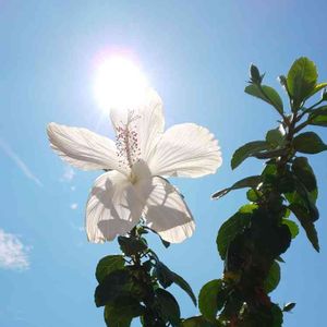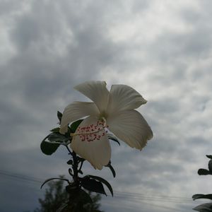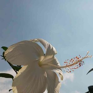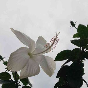 こんばんは😃🌃 ハイビスカスヘップバーンホワイトちゃん空も真っ白❗️ シベも上向いて気持ち良さそう🌺