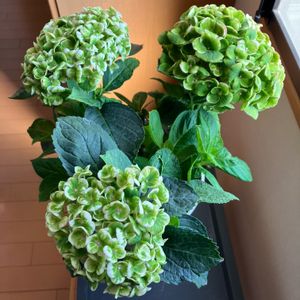 紫陽花のマジカルレボリューションがピンクから終盤?の緑色に…? 所々の茶色の理由は買ってきて直ぐに陽射しに当ててしまったから💦 色の変化を見たくてひとつだけ残して様子見👀してま〜す😅