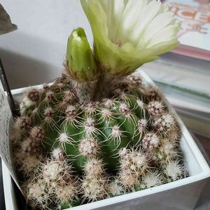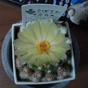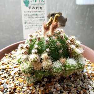 菫丸は、花が終わって一回り大きくなった いい感じの扁平ぐあいだ(^^) 琴糸丸は、モジャが増して地味な花が咲いた(^^) 奇仙玉は、植え替えたら蕾が来た こっちはいい感じの玉、2頭身(^^)