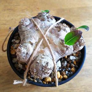 パキポディウム ブレビカウレ (恵比寿笑い) 先月お迎えした、未発根の恵比寿笑い。 確認した後、植え直し麻紐で固定した状態です😁 そのショックか、葉っぱがだいぶ落ちました😓 まだ動きが無い、早く暑くならないかなぁ😅