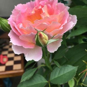 こんにちは☀️薔薇 ペネロペイアです 今年も咲いてくれました🌹💓 ピンク色をベースにクリーム、アプリコット、黄色が混じり合う花いろ🥰 弁先が尖る波状弁咲きです✨✨ 花名はギリシャ神話オデュセウスの妻の名前です😊