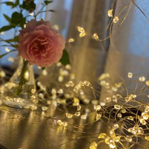 お気に入りのフェアリーライトコーナーに置いたらしゅてき😍 バラが1輪なのが残念ですが😅 ミントのお花と一緒に☺️