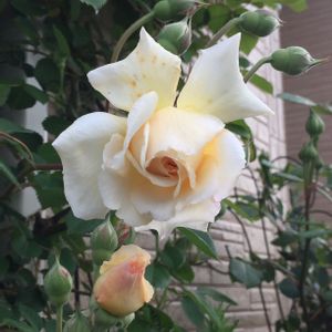 また、このお花の名前、忘れちゃった😅 長年我が家と一緒のつるバラさん🌹 髪切り被害や癌腫を克服して、 中輪だけど、前より大きく開花してくれた 房咲きになると、小さなブーケのように💐 蕾もいっぱい‼️楽しみなバラさんです🌹