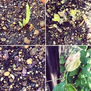 今朝のワクワクさせてくれた4種🌱🎶 左上 : 姫しゃがの芽がかなり伸びてきて楽しみ🌱💕花が咲くまで後どのくらいかな。 左下 : 大好きな桔梗(紫色)が4鉢無事に出てきて嬉しい気分🌱💕 右上 : 大好きな桔梗(白色) 右下 : クレマチスのアンドロメダが少し開いてきました🌸🍃我が家で初めての開花になるので どんなお花か楽しみ😊💕