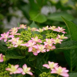 ライムグリーンのハーモニーが白く重くなってきました ダンスパーティーは例年よりピンクが濃く咲いています