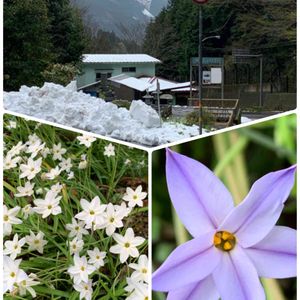 白いハナニラの中に紫の花が一輪💜一杯、増えて欲しいです💕💕 アルバイトに行く途中トンネルを抜けると雪が積もってました〜🥶☃️☃️