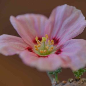 モンソニア 塊根植物 コーデックス サルコカウロン属 バンデルリチアエ。(竜骨扇)😸😽 こちらも、今朝咲いてました。😋 薄いピンクの可愛らしい花です。😋 ビニール温室から出して撮影。😊