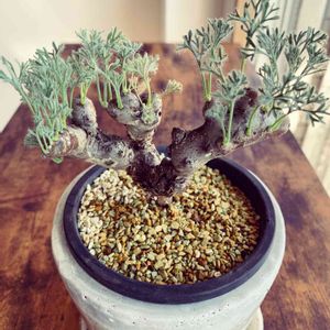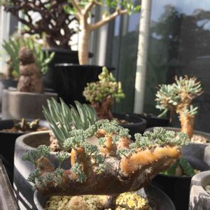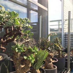 今日は天気が良いので、塊根・アガベ・チランジア・その他諸々ベランダで日光浴しております☀️ 流石に置き場に困ってきたので午後はガーデンラック買ってこよっと💦 写真の子は、サルコカウロン・ムルチフィズム ムチムチした樹形に、ふわふわした繊細な葉を持った可愛い子です✨ ここ最近は葉っぱが出ては抜けを繰り返しているのですが、こういうもんなんですかね。ちょっとわかりません。 3〜4日したら生えてくるから良いんだけど、私としてはフワフワで幹を全体を覆ってくれるのを楽しみにしてるんだけど…( ・᷄ὢ・᷅;)