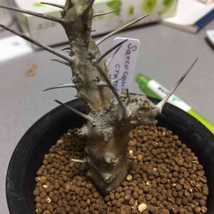 サルコカウロン クラシカウレー マクロ撮影 彼は冬になると芽をだします。 かわいい緑が株のあちらこちらからポツポツと芽吹く。 大きい棘に似合わずかわいい緑の葉っぱ。 ギャップだねぇ。