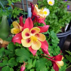 鮮やかな「オダマキ」 お隣さんから我が家にきました❣️ 「シロヤマブキ」 オレンジっぽいのも咲き出した「スパラキシス」3色あったみたいです😅 「雲南黄梅」 剪定し過ぎたかも… 新芽から紅葉したような「モミジ」 鮮やかです🍁