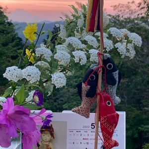 5月に入っても富士山がはっきり出てくれなくてなかなか撮れませんでしたが、こどもの日に世界中の子供達の幸せを祈りつつ🙏 まだ頑張ってくれている先日の庭花も一緒にほっこりお人形コラボ🏷カレンダーの日に参加させて下さいね💝