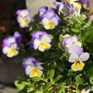 夕方、外に出ると 夕陽を浴びたパンジーが きれいに咲いていました 今日は朝は曇っていましたが 昼間は日差しが出て暖かい日でした 今、我が家では花が少なくて パンジーが一番元気です