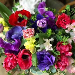 春のお花のboxアレンジです。 チューリップ、アネモネ、スイートピー、ユーカリ、ブプレム、ヒムロスギ 真上から撮影してみました。