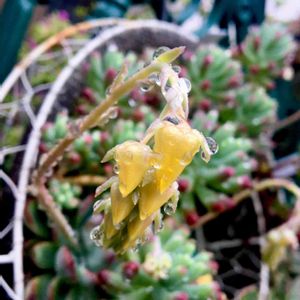 エケベリアの花はなハナ ピンクチップスと花うららばかりなので、みんな黄色だな😆 左端にオレンジ(七福神)と白(春萌)もあるけどボケとる(๑>◡<๑)