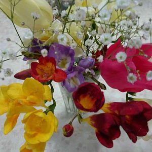 切り花フォトコンエントリーこちらも出します フリージア白色紫色、やや橙色、黄色と🌷赤白色 カスミ草、スターチス 硝子の薔薇🌹の絵柄の花瓶に。