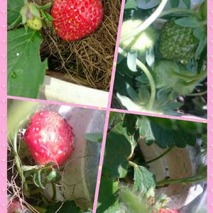 2021,4,11この前買った苺🍓苗を定植 上🏷下苗の花と、これから実になるかもしれない黄緑実 品種名#ローズベリーレッド
