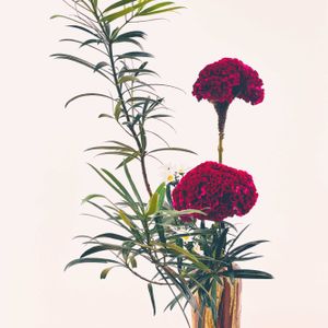 鶏頭もそろそろ終わりの時期。 オバケ鶏頭を使っての瓶花です。
