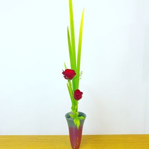 京都の祇園祭の伝統的ないけばなと言えば檜扇を使われるらしいです。 ですが、自由にさせてもらったので檜扇の勢いを生かしてエキゾチックな花器に合わせました。