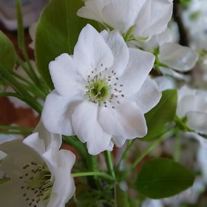 ハウスで咲いた梨(幸水)の花 暮れに剪定した枝をハウスの中で水に浸けて、販売などする物をいただきました☺️ 露地物より一足早く満開に❗️💓 いけばな等に喜ばれますが、花粉が部屋中に…くしゃみも出ます❗️😅 開いたら外の玄関等で楽しみます。 青系の幸水の花は格別キレイ‼️