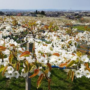 野菜畑の梨 幸水と豊水の花が咲きました 他花受粉できるように、並べて植えてあります