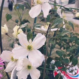 おはようございます☀ 人生初のクレマチス!! スノーフレークとかいうやつ。 花は小さいけど可愛い😍 長く楽しめるといいなぁ。 地植えにしたいけど、這わせるフェンス的なやつがちょうどいい場所にらなくて悩み中…😂