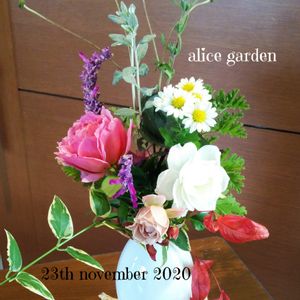 受付にお花を。 庭の花を摘んでブーケに💕 皆さんに愛でられて お花も幸せなひととき💕✨ プリンセスアレキサンドラオブケント、アイスバーグ、伊織、 マム、オタフクナンテン、ゼラニューム、弦日々草、秋明菊、ツリージャーマンダー、フレンチラベンダー、メキシカンセージ、リグラリア