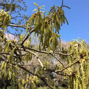 🌿ハチジョウキブシ🌿 でしょうか? 長いかんざしのような花がたくさん下がっています。 葉は大きいです。 教えていただきました。 訂正します。 🌿クヌギ🌿でした。
