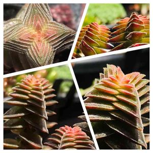 クラッスラでも群を抜いた幾何学図形のような暁の峰(茜の塔錦)です😊 成長点をぐいーんと伸ばしてお花をつけるんですが、これまた心配になるくらい伸びます😂子株をたくさん付けてくれますが、花後は枯れてしまいます☺️ 正面も好きですが葉裏からみる↗️のも好きです✨